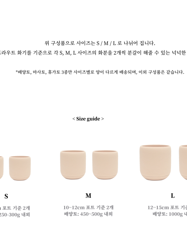S, M, L 각 사이즈별 2개의 화분을 분갈이 하기에 넉넉한 양으로 구성됩니다.